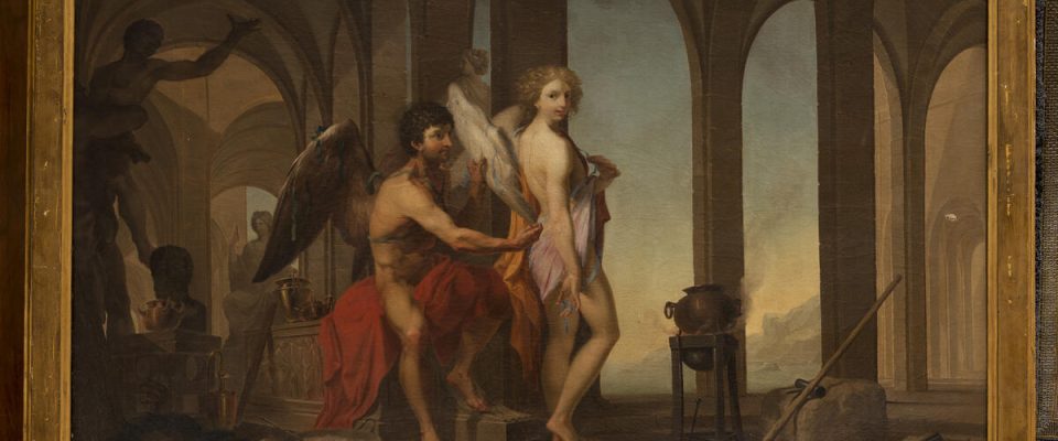L’opera in esame fu inserita, nel 1943, nella lista delle opere d’arte di notevole importanza da rimuovere temporaneamente dalle stanze del Ministero dell’Interno per essere trasportate in luoghi più sicuri ai fini della protezione antiaerea (ACS, MPI, AA.BB.AA., div.III, 1929-1960). Documentata fino al 1952 presso il Ministero, venne successivamente trasferita nell’Università per decorare i locali di rappresentanza del Rettorato (BILLI 2023). Il quadro raffigura un episodio del mito di Dedalo e Icaro, in particolare, il momento in cui Dedalo è intento a posizionare le ali appena costruite sulle spalle del figlio per fuggire dal labirinto del Minotauro. La scena si svolge in un loggiato all’antica, disse- minato, nella parte sinistra di statue e manufatti bronzei a sottolineare le doti costruttive di Dedalo, vera e propria personificazione dell’uomo di téchne, dedito per tutta la vita alla scultura e all’architettura. Se l’iconografia è di facile comprensione, risulta invece più problematica la questione attributiva. Sul retro del dipinto è posta un’etichetta con un’iscrizione che indica il nome dell’autore: «il signor Gioanni Batista Bagutti scolaro di m.ur Baldrighi». Nella scheda ICCD, redatta nel 1994, l’opera è invece assegnata a Giuseppe Baldrighi (OA 12 00252393) e così compare nel catalogo della Galleria Nazionale di Arte Antica (MOCHI ONORI 20083). Ad una prima analisi stilistica il quadro, tuttavia, non sembra appartenere né alla mano di Baldrighi né a quella del suo allievo Bagutti, piuttosto a quella del pittore Biagio Martini, artista parmense attivo a cavallo tra la seconda metà del Settecento e la prima metà dell’Ottocento. Dalle fonti si apprende che Martini nel 1790 partecipò ad un concorso indetto dall’Accademia di Belle Arti di Parma. Quell’anno il tema scelto fu «l’Atto, nel quale Dedalo accomoda al figlio Icaro, ed assetta le ali». Secondo le disposizioni dell’Accademia «non si eccederanno nei Quadri la misura di quattro palmi romani di altezza, e sei di larghezza, e le tele si spediranno avvolte, e rotolate sopra un bastoncino […]» (PELLEGRI 1988, p. 252). Il primo premio venne assegnato all’artista francese Tillerand, mentre Biagio Martini si classificò secondo, a parimerito con Antonio Corsi. L’opera del Martini venne così descritta: «Grazioso scorgersi in questa tela il movimento dell’Icaro; ben toccati e dipinti i molti accessori, che arricchiscono questo Quadro» (PELLEGRI 1988, p. 255). L’autografia del quadro, oltre che dalle fonti, è supportata anche da un disegno conservato nella Biblioteca palatina di Parma classificato come «Testa di giovane donna» (Biblioteca Palatina, Manoscritto parmense 3714, cartella III, n. 147) (Fig. 1), finora mai collegato al nostro dipinto, ma perfettamente aderente al volto di Icaro ivi rappresentato. Sebbene il disegno sia stato inizialmente attribuito a Gaetano Callani, maestro di Martini, è stato poi restituito dalla critica alla mano di quest’ultimo (CIRILLO, GODI 1991, p. 228). Si può inoltre segnalare che presso la stessa biblioteca è conservato un altro disegno (Fig. 2), che di nuovo rap- presenta Dedalo e Icaro (Biblioteca Palatina, Manoscritto parmense 3698, n. 1), assegnato al Martini, ma dalla discussa paternità (CIRILLO, GODI 1991, p. 288). Il tocco della penna e l’acquarellatura macchiata sembrano rimandare piuttosto alla maniera del primo classicismo, più vicina allo stile di Giuseppe Baldrighi e di Pietro Melchiorre Ferrari, primo maestro del Martini (CIRILLO, GODI 1991, p. 228).