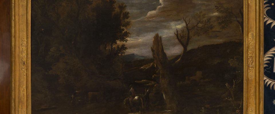 Il Paesaggio con cavaliere e buoi (olio su tela, cm 117 x 146) entrò nella collezione della Città universitaria quasi certamente nel marzo del 1954 insieme a un nucleo di altre tre opere cedute in deposito temporaneo all’università (Billi, infra, p.). Il dipinto apparteneva originariamente alla collezione delle Gallerie degli Uffizi, come indica l’iscrizione “Uffizi 649” sull’intelaiatura del supporto, accompagnata da una seconda etichetta posizionata lungo il montante sinistro della cornice, su cui si legge “Sc. Toscana sec. XVII – Paese con contadini 649/Prot. Soprintendenza di Firenze”. La storia della provenienza del dipinto è restituita dalla scheda di catalogo delle opere degli Uffizi [Inventario 1880 – 1882 n. 1165, (III Categoria), 1880 – 1881], in cui si riporta che, prima di essere destinata all’Opera Nazionale Invalidi di Guerra di Roma (25-10-1928, data d’ingresso), la tela passò dal Palazzo degli Uffizi al Corridoio Vasariano, per essere conservata successivamente nel Magazzino degl’Occhi di Palazzo Pitti. Con molta probabilità, il Paesaggio con cavalieri e buoi, prima di essere collocato nell’edificio del Rettorato della Città universitaria, fu trasferito dall’Opera Nazionale Invalidi di Guerra ai depositi di Palazzo Venezia, luogo dal quale fu prelevato nel 1954. Nello stesso anno venne redatta la scheda di catalogo inserita nella raccolta della Galleria d’Arte Antica di Palazzo Barberini [Barberini Inv. N. 5013 (F.N. D13)], aggiornata durante una più recente campagna di catalogazione dell’Istituto Centrale per il Catalogo e la Documentazione (OA 00252392), in cui viene registrato un intervento di restauro sul dipinto, ad opera di De Lama, datato al 1954 – con ogni probabilità eseguito in occasione dell’ingresso della tela nella collezione della Città universitaria.