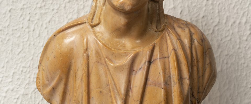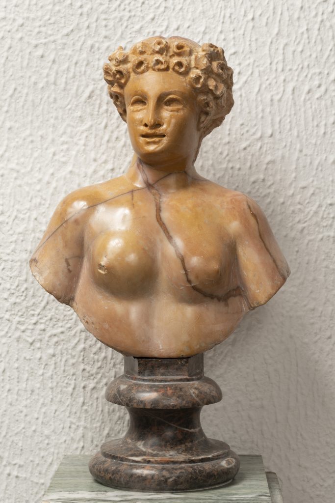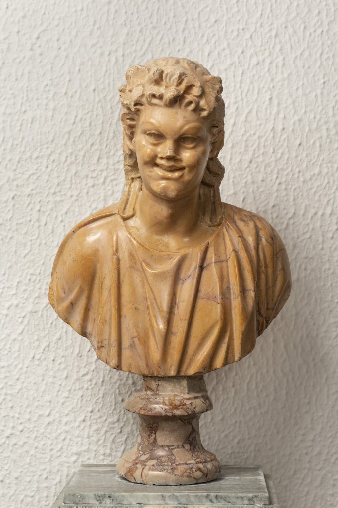 Nel documento di richiesta di concessione in deposito delle opere dal Museo Nazionale Romano all’Università, del 20 ottobre 1954 (BILLI 2023, p. 96), queste opere, senza numero di inventario e delle quali non si conosce la provenienza, sono indicate rispettivamente come «Busto di satiro in marmo giallo rosa» e «Busto di efebo in marmo giallo». Per quanto riguarda il Satiro (Fig.1), la sua natura legata al mondo dionisiaco è confermata dalla caratterizzazione del volto, con espressione ferina, il sorriso che lascia in vista i denti e l’arcata sopracciliare molto marcata. Le orec- chie sono caratterizzate da una forma appuntita e la capigliatura è ondulata, ornata da tralci vegetali che trattengono i riccioli intorno alla fronte e al volto, mentre una tenia scende lungo le spalle, coperte da una tunica che ricade con fitte pieghe. Il retro della testa è piatto e liscio ma più in basso il busto, in un marmo venato di rosso, appare fortemente incavato e appena sbozzato. Testimonianze di satiri con espressioni simili al nostro, anche con capigliature caratterizzate da tenie e decorazioni vegetali, esistono già nell’antichità, ad esempio in erme provenienti dall’ambito vesuviano (INSERRA 2008a; INSERRA 2008b; POCHMARSKI 1990). Tuttavia, in tutto il mondo classico normalmente i giovani satiri non sono raffigurati con tuniche o altri capi di abbigliamento simili a quello dell’esemplare qui in esame, ma piuttosto nudi o vestiti solo di una pelle ferina (SIMON 1997). Il volto del cosiddetto Efebo (Fig.2) invece è quello di un personaggio sorridente dai tratti giovanili, dal setto nasale fortemente appiattito, che guarda verso la propria destra. I capelli, che presentano una scriminatura centrale, sono acconciati in due file di riccioli sulla fronte e tre sui lati. Il busto, innaturalmente allargato nella parte al di sotto del seno, quasi a seguire la linea delle braccia, non corrisponde alla testa né per proporzioni né per il tipo di marmo impiegato. Esso sembra rimandare, soprattutto per la resa del seno, ad una figura femminile, dalle morbide e appena accennate forme giovanili più che a un efebo. Non essendo presenti negli archivi della Sapienza e del Museo Nazionale Romano documenti contenenti informazioni sulla provenienza originaria dei due pezzi, non è possibile avere certezza di una loro precedente esposizione congiunta. Tuttavia, l’affinità del materiale, le dimensioni simili sia delle due opere che dei loro peducci, fanno pensare ad una esposizione en pendant. Un’ipotesi preliminare potrebbe dun- que essere che nel cosiddetto Efebo si sia voluta rappresentare una figura che, in coppia con il vicino Satiro, riportasse alla mente il mondo dio- nisiaco, probabilmente una Menade (JOYCE 1997; FERRARA 2020), con elaborata acconciatura, volto giovanile e labbra dischiuse. Ad essa possono es- sere parzialmente avvicinabili esempi di derivazione ellenistica (si veda, solo per fare un esempio, la Testa di Menade ai Musei Vaticani, inv. 10304, pubblicata da ultimo in FERRARA 2020, p. 94, cat. 14). L’assenza di certi attributi legati alle menadi, però, deve far ampliare il campo delle ipotesi, allargandosi anche ad altre figure giovanili che possono mostrarsi a petto nudo e con simili espressioni facciali: è il caso, ad esempio, di immagini di ninfe, anch’esse spesso raffigurate assieme a satiri e con punti di contatto con le rappresentazioni di menadi (HEDREEN 1994). Immagini di ninfe a petto nudo, con volti giovanili e talvolta sorri- denti sono attestate nel mondo antico (HALM-TIESSERANT-SIEBERT 1997) e uno dei casi non troppo distante dall’opera in esame, solo per l’espressione del volto e il movimento di leggera torsione del capo, è conservato al Museo Gregoriano Profano ex Lateranense (inv. 10282, VORSTER 2004, p. 172, cat. 133). Il retro della testa, scolpito in corrispondenza di un’ampia venatura rossa del marmo, presenta una forte lacuna che non permette di vedere né la parte posteriore dell’acconciatura, né tanto meno la sua lavorazione. Il retro del busto, invece, si presenta fortemente incavato e sbozzato. Come per il Satiro, il materiale del busto non è stato sottoposto ad analisi archeometriche, ma si può supporre che si tratti di marmo giallo, non necessariamente giallo antico (si veda MASTROROBERTO 2002 per esempi di erme in questo tipo litico). A giudicare da alcuni dati iconografici e dalla caratterizzazione di certuni elementi figurativi si può supporre che la copia di opere in esame sia una creazione non antica, ma che all’antico si ispira, senza comprenderlo pienamente. Si può ipotizzare una datazione al XVII- XVIII secolo, quando, parallelamente allo sviluppo delle collezioni di antichità, sia pubbliche che private, si diffuse l’uso di creare e commerciare sul mercato antiquario manufatti “all’antica” integralmente falsi, oppure frutto della combinazione di elementi di età antica e moderna (CALDELLI 2014, p. 51).
