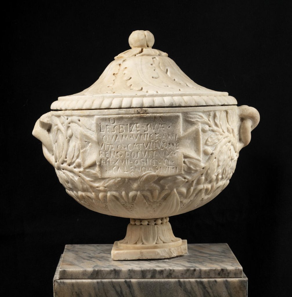 Si tratta in questo caso di un testo d’invenzione, di cui sono state individuate altre due copie con poche variazioni: l’iscrizione, CIL, X 344* su una lastra del Museo Archeologico Nazionale di Napoli e l’epigrafe che fu vista dall’archeologo Guido Barbieri in una collezione privata a Roma in via del Corso (PANCIERA 2006, p. 1688), della quale non si conoscono ulteriori notizie. L’esistenza di tali ri- produzioni è certamente un’ulteriore prova della falsità del testo, nonché della fortuna di cui esso dovette godere. Il modello letterario dal quale fu desunto è il carme 58 di Catullo, nel quale il poeta, rivolgendosi all’amico Celio, esprime la propria delusione circa il comportamento immorale e dissoluto di Lesbia. La tragicità della vicenda amorosa ha evidentemente ispirato il falsario nel trasformare il sentimento di sdegno, di amara nostalgia e di acceso rimpianto per il passato, evocato dall’espressione illa Lesbia, quam Catullus unam / plus quam se atque suos amavit omnes, nella mesta e pia devozione dimostrata dal dedicatario Catullo alla morte prematura della sua Lesbia, che qui, a differenza della più matura Lesbia dei carmi catulliani, è un’adolescente di soli 17 anni. L’assenza di un modello epigrafico da seguire ha determinato nel testo della nostra urna vistose incongruenze, quali l’uso della sigla D.M., attestato soltanto dopo la metà del I secolo d.C., e la presenza stessa della data della morte, in cui tra l’altro il giorno compare inusualmente abbreviato all’iniziale q dell’ordinale quintus (invece che con la cifra V) e le calendae, scritte per esteso, sono seguite dal genitivo Iulii, invece che dall’atteso accusativo Iulias (CALDELLI 2008, p. 1366).