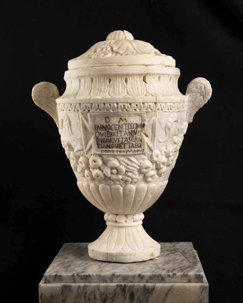 Le due urne funerarie, corrispondenti alla tipologia a vaso, sono attualmente esposte nel corridoio del Senato Accademico all’interno del Palazzo del Rettorato, ivi collocate dal 1954 (BILLI, infra, pp. 96-97). La prima urna (Fig.1), costituita da un corpo di forma quasi emisferica, poggia su un piede a campana, scolpito con foglie e coronato da perline. La parte inferiore del corpo è decorato da foglie della medesima tipologia alternate a palmette, mentre la parte superiore è ornata da folti rami di alloro con bacche, il cui andamento curvilineo sembra armonizzarsi all’intreccio delle due anse laterali. Al centro del corpo è collocata una tabula ansata iscritta. Il coperchio è caratterizzato da una presa a bocciolo, dal quale si estendono elementi fitomorfi che ne seguono elegantemente la forma. La seconda urna (Fig.2) si distingue per un andamento più verticale e allungato ed è posizionata su un piede scolpito con foglie lanceolate, terminante, anche in questo secondo esemplare, con una fascia di perline sferiche. Il corpo è costituito da due sinuose anse laterali a voluta, dalle quali sembrano pendere altrettanti festoni di fiori e frutta. Al di sopra della tabula ansata iscritta, collocata al centro del corpo dell’urna, sono presenti un kyma lesbio e, nella porzione concava, una fascia di foglie che riprende l’orientamento degli elementi vegetali presenti sulla base. Il coperchio, caratterizzato da foglie d’acanto e rose, culmina anch’esso con una presa a bocciolo. I due manufatti provenivano originariamente dalla collezione tardo settecentesca del cardinale Francisco Saverio de Zelada. La vasta raccolta, che testimonia gli ampi e diversificati interessi del porporato, comprendeva anche un’importante collezione epigrafica, approfonditamente studiata da Maria Letizia Caldelli, che ne ha recentemente curato il catalogo (CALDELLI 2021). Date le molteplici mansioni che furono affidate al de Zelada soprattutto dalla seconda metà del Settecento, le sue collezioni si trovarono a insistere in diversi luoghi, fra cui il Vaticano e il Museo kircheriano presso il Collegio Romano, ed è proprio in quest’ultima sede che furono conservate le due urne in esame, prima di giungere al Museo Nazionale Romano, in seguito alla dispersione della collezione cardinalizia, avvenuta nel 1801, alla morte del porporato. Nell’ambito della raccolta epigrafica comparivano quindici urne iscritte, caratterizzate da stilemi costruttivi e decorativi fra loro molto simili, tali da poter essere considerate un “gruppo” omogeneo e coerente (CALDELLI 2008, pp. 1369-1370). La fattura delle suddette urne risale ad un periodo compreso tra la fine del settimo e dell’ottavo decennio del Settecento, ovvero l’epoca di costituzione della collezione de Zelada. La realizzazione di tali oggetti fu opera di botteghe, come quella del Piranesi o del Cavaceppi, che si specializzarono nella produzione in serie di manufatti all’antica e nella realizzazione di false epigrafi, copie integrali o parziali di originali prototipi, oppure iscrizioni ideate ex novo. In particolare, sembrerebbe probabile avvicinare i due manufatti in esame ai prodotti della bottega piranesiana di Palazzo Tomati in via Sistina a Roma, con la quale il cardinal de Zelada doveva essere entrato in relazione (CALDELLI 2008, p. 1374). Dunque, sebbene non sia possibile affermare con certezza che le due urne siano completamente di età moderna, né che siano costituite dall’assemblaggio e dalla manomissione di elementi antichi, le epigrafi, tuttavia, costitu- iscono inequivocabilmente dei falsi settecenteschi.